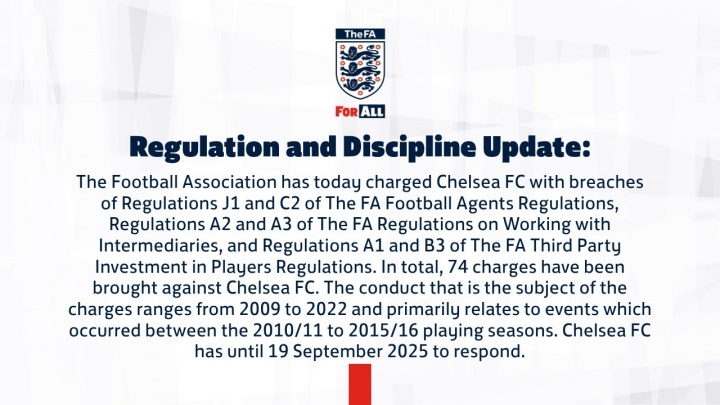 英格兰足球总会今日对切尔西足球俱乐部提出指控,其违反《英足总足球经纪人条例》J1和C2条款、《英足总中介合作条例》A2和A3条款,以及《英足总第三方球员投资条例》A1和B3条款。切尔西俱乐部共面临74项指控,涉及2009年至2022年期间的违规行为,主要集中于2010/11至2015/16赛季期间。切尔西俱乐部需于2025年9月19日前就此作出回应。