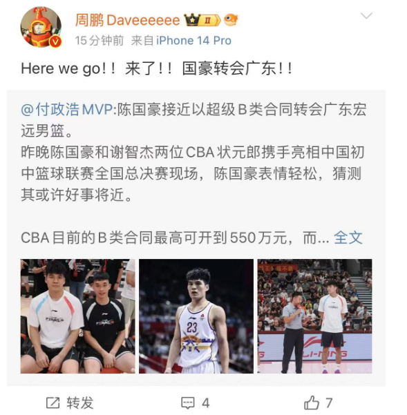 如今根据媒体人付政浩报道:“CBA目前的B类合同最高可开到550万元,而且此番引入陈国豪,广东男篮不仅将王少杰送还北控,还将为陈国豪付出一笔额度惊人的转会费,这对广东男篮这类日常转会支出方面比较严谨的民企而言,绝对算是下了血本了,宏远的诚意满满。”